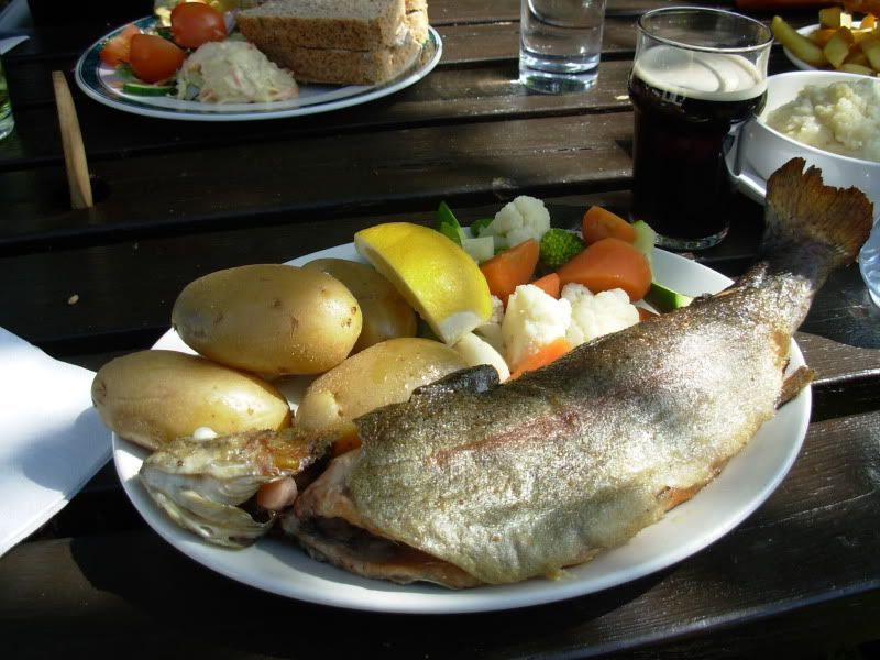 When we were back on the mainland, we were all pretty ravenous and immediately began searching for lunch. As it's a bank holiday, it took us a little while to find somewhere to eat, and I was in "attack wildlife" mode. Lunch was tasty, but my eyes were bigger than my stomach. I ordered a cheese starter, a local trout, and a side of mash. This is really the second time I've ordered fish in the UK, and as with the Whitebait, I was served the WHOLE fish!